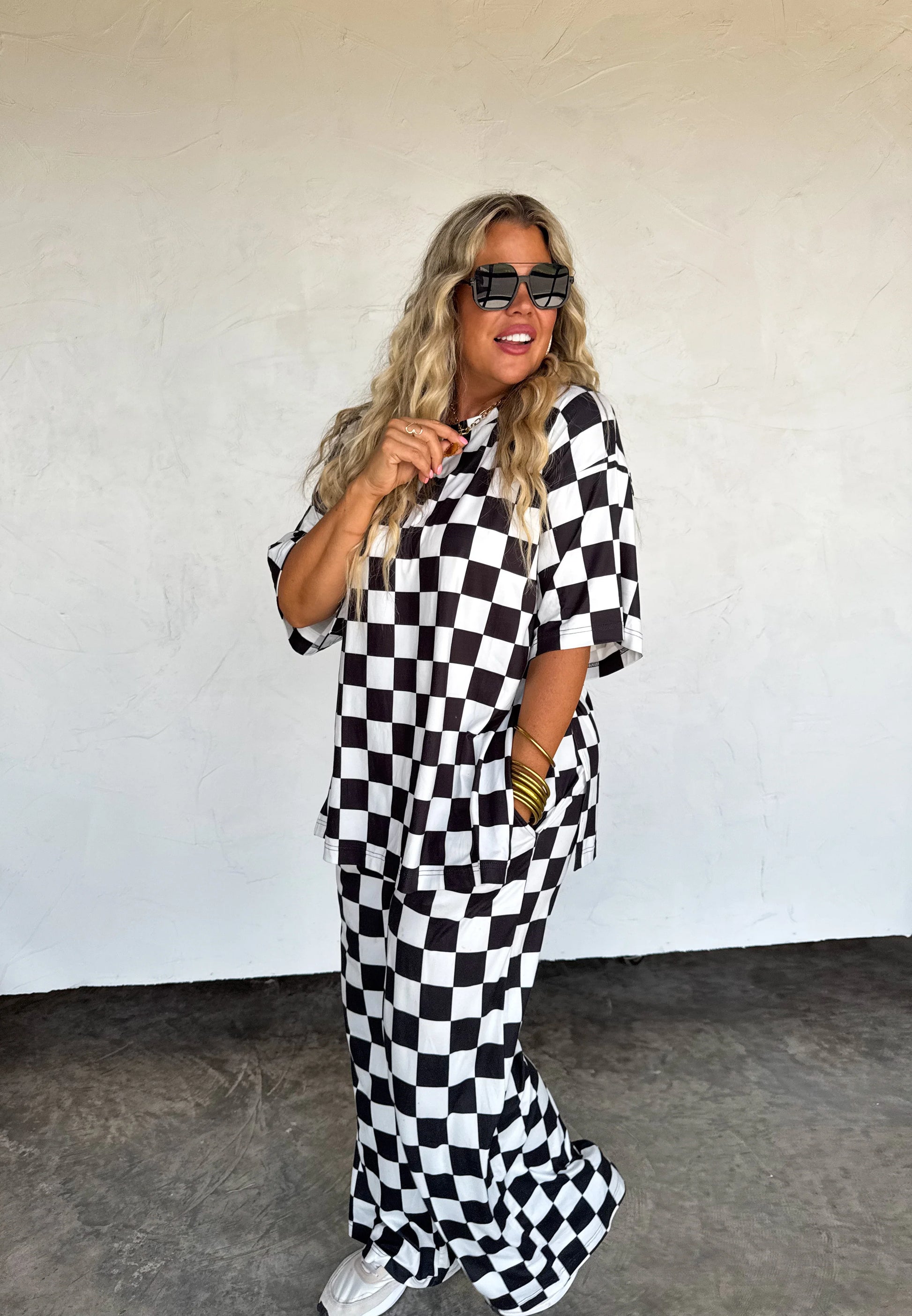 Cloud soft and so so stretchy! These bold checker pants are the perfect way to add a "pop" to any outfit!! Features front pockets, a faux tie string and elastic waist.